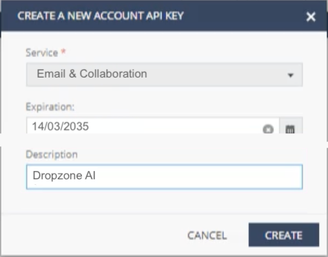 * In the Description field, enter a memorable description for the API Key, such as "Dropzone AI"