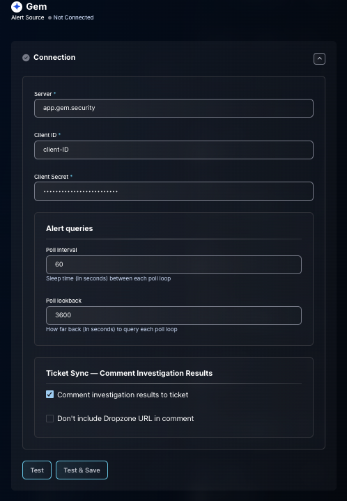 * Click "Comment Investigation Results to ticket" if you want Dropzone to push investigation results back to Gem
