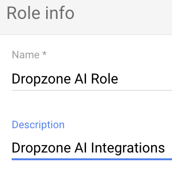Name the role something memorable, such as "Dropzone AI Role." Input a description, such as "Dropzone AI integrations," then click "Continue"