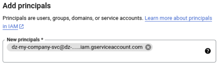 * Under "New principals," input the email address you copied earlier from the Dropzone UI "SERVICE ACCOUNT EMAIL"