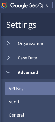 <figure><img src="https://435022081-files.gitbook.io/~/files/v0/b/gitbook-x-prod.appspot.com/o/spaces%2FmBVcKuiytGCsIDpL70BC%2Fuploads%2Fgit-blob-c817bc7034e746a137eebc6c99352eb1366c0b6b%2Fgoogle-secops-14.png?alt=media" alt=""><figcaption><p>Navigate to API Keys</p></figcaption></figure>