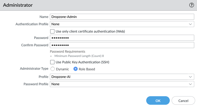 <figure><img src="https://435022081-files.gitbook.io/~/files/v0/b/gitbook-x-prod.appspot.com/o/spaces%2FmBVcKuiytGCsIDpL70BC%2Fuploads%2Fgit-blob-5a12e835b5d95e25ae203f1a04cdf6c1fb0457c2%2Fpalo-alto-6.png?alt=media" alt=""><figcaption><p>Create a new Administrator</p></figcaption></figure>