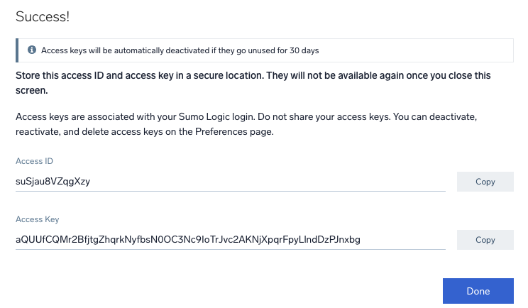 <figure><img src="https://435022081-files.gitbook.io/~/files/v0/b/gitbook-x-prod.appspot.com/o/spaces%2FmBVcKuiytGCsIDpL70BC%2Fuploads%2Fgit-blob-f07cced94430f06655f0f5d459ce0573eb456518%2Fsumo-logic-api-4.png?alt=media" alt=""><figcaption><p>Copy API Key and Secret</p></figcaption></figure>
