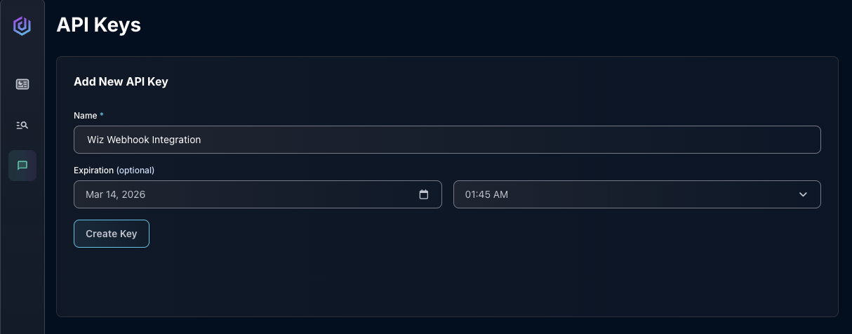 * In the "Add New API Key" section, name the API key something memorable, such as "Wiz Webhook Integration"