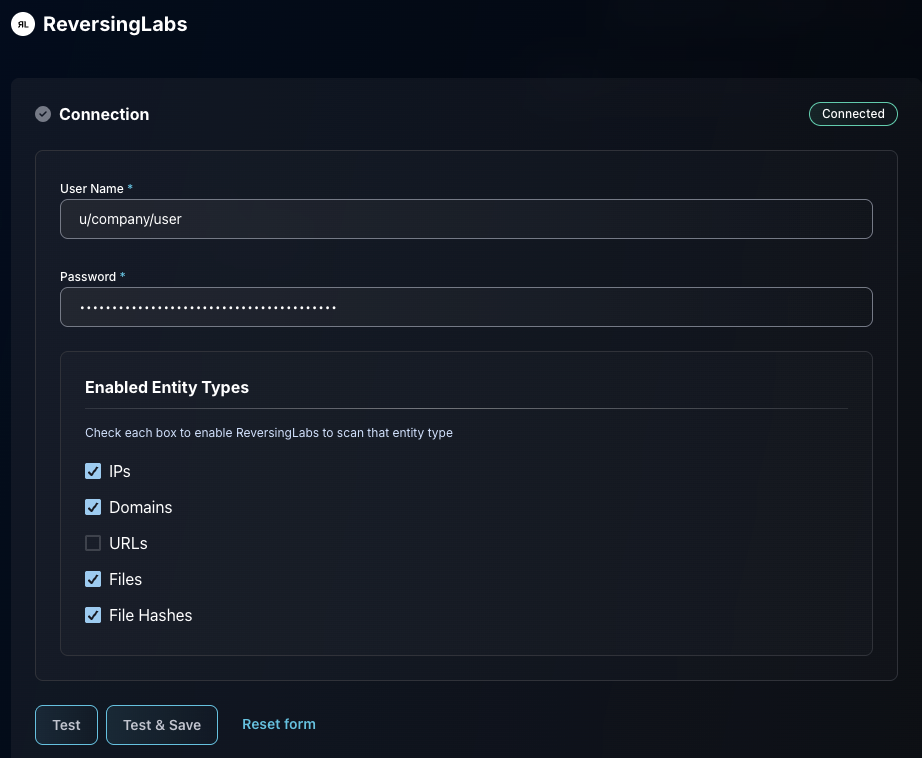 | User Name      | The username of your ReversingLabs account in the form of a string, e.g. u/company/user |